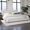 Crafted with a focus on comfort and durability, this platform bed features a sturdy wood slat kit, eliminating the need for a box spring and ensuring robust support throughout restful nights. The fully padded bed rail and footboard further enhance the bed’s plush aesthetic, inviting you to indulge in both visual and tactile pleasures. The sleek, low-slung design enhances the modern appeal, making it a perfect fit for contemporary and transitional home decor styles.